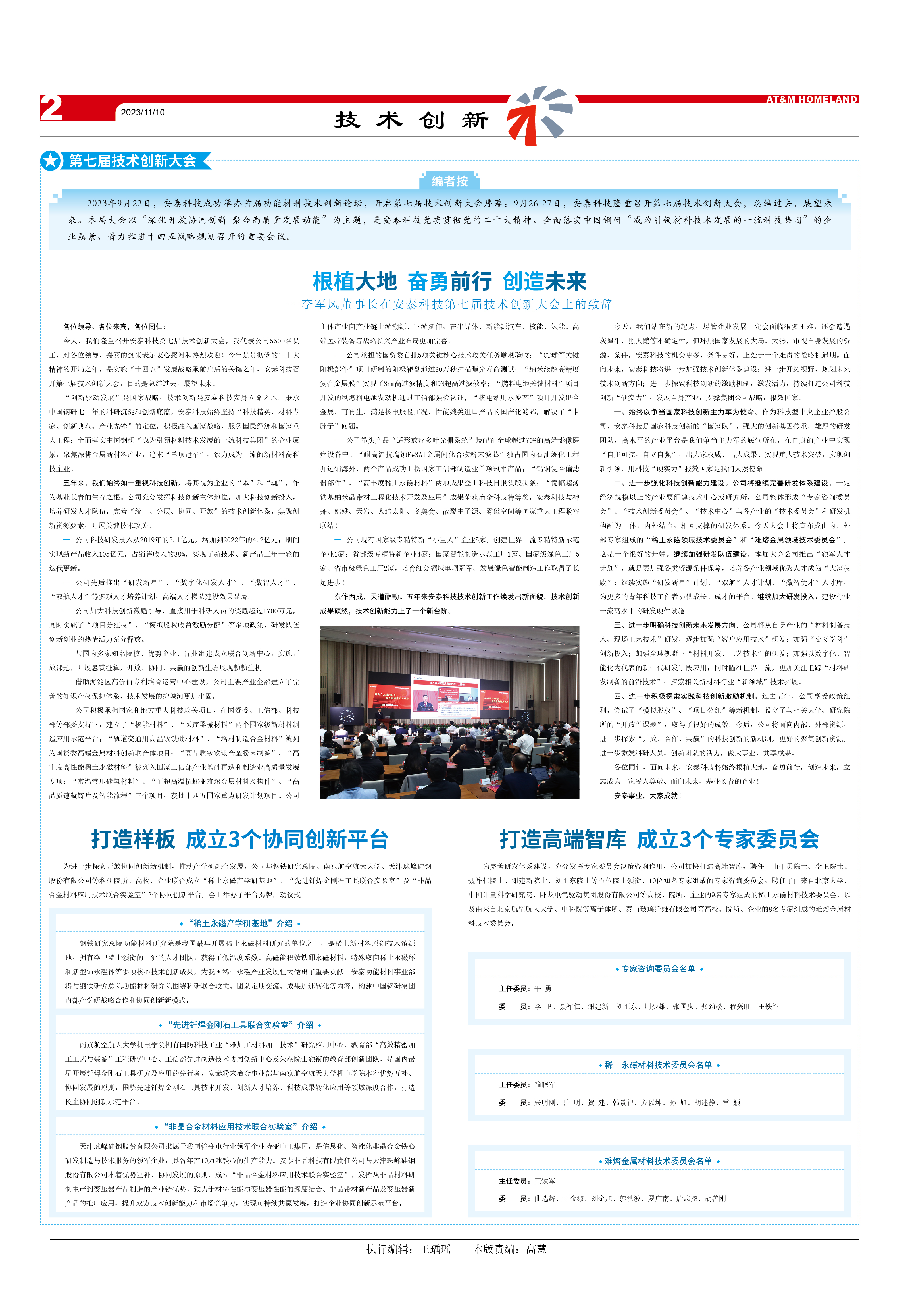 2023922日,安泰科技成功举办首届功能材料技术创新论坛,开启第七届技术创新大会序幕。9月26-27日,安泰科技隆重召开第七届技术创新大会总结过去,展望未来。本届大会以“深化开放协同创新 聚合高质量发展动能”为主题,是安泰科技党委贯彻党的二十大精神、全面落实中国钢研“成为引领材料技术发展的一流科技集团”的企业愿景、着力推进十四五战略规划召开的重要会议。